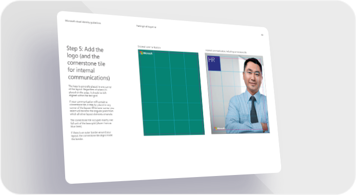 MicrMicrosoosofft visual identity guidelinest visual identity guidelines Putting it all together 63 External communication Internal communication, including cornerstone tile Step 5: Add the HR logo (and the cornerstone tile for internal communications) The logo is generally placed in one corner of the layout. Regardless of where it’s placed on the page, it should be left- aligned within the text grid. If your communication will contain a cornerstone tile, it may be placed in any corner of the layout. Whichever corner you select will become the singular point from which all other layout elements emanate. The cornerstone tile occupies exactly one full unit of the base grid (shown here as blue lines). If there is an outer border around your layout, the cornerstone tile aligns inside the border.