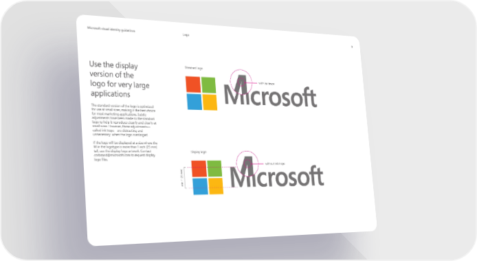 MicrMicrosoosofft visual identity guidelinest visual identity guidelines Logo 9 Standard logo Use the display version of the with ink traps logo for very large applications The standard version of the logo is optimized for use at small sizes, making it the best choice for most marketing applications. Subtle adjustments have been made to the standard logo to help it reproduce cleanly and clearly at small sizes. However, these adjustments— called ink traps—are distracting and unnecessary when the logo is enlarged. If the logo will be displayed at a size where the M in the logotype is more than 1 inch (25 mm) tall, use the display logo artwork. Contact Display logo [email protected] to request display logo 昀椀les. without ink traps min: 1" (25 mm)