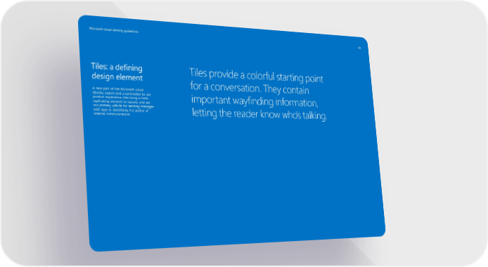 Microsoft visual identity guidelines 40 Tiles: a de昀椀ning Tiles provide a colorful starting point design element for a conversation. They contain A new part of the Microsoft visual identity system and a connection to our product experience, tiles bring a fresh, captivating element to layouts, and are important way昀椀nding information, our primary vehicle for sending messages with type or identifying the author of letting the reader know who’s talking. internal communications.