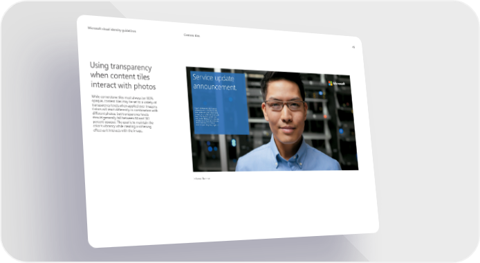 MicrMicrosoosofft visual identity guidelinest visual identity guidelines Content tiles 45 Using transparency Service update when content tiles announcement. interact with photos While cornerstone tiles must always be 100% opaque, content tiles may be set to a variety of Uga. Ut ullatque minctat ibusamet transparency levels when applied over imagery. alibus alit, commo debit estiat of昀椀c Colors will react differently in combination with torernatatur aut quae dolupiet ellit, im aut uta qui accae parcius molupta different photos, but transparency levels tatatur? Alitius dolo quatet lique eseque labo. Bisseque ommoluptam should generally fall between 80 and 100 recestia seris sumque debit doloren daeror sunt lam qui omnis pa percent opaque. The goal is to maintain the nusamus ipsam fugitatur, fugitatur? color’s vibrancy while creating a softening effect as it interacts with the image. Internal banner