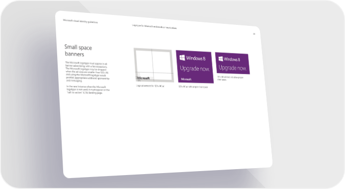 MicrMicrosoosofft visual identity guidelinest visual identity guidelines Logotype for Microsoft-endorsed communications 20 Small space banners The Microsoft logotype must appear in all Upgrade now. Upgrade now. banner advertising, with a few exceptions. The Microsoft logotype may be dropped when the ad sizes are smaller than 120 x 90 120 x 60 ad does not allow proper and using the Microsoft logotype would clear space. prohibit appropriate subbrand sponsorship and messaging. Logo placement for 120 x 90 ad 120 x 90 ad with proper clear space In the rare instance when the Microsoft logotype is not used, it must appear on the “call-to-action” (CTA) landing page.