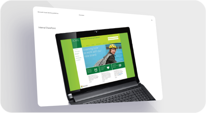 Microsoft Brand Book Page 72 Page 74MicrMicrosoosofft visual identity guidelinest visual identity guidelines Showcase 70 Internal SharePoint