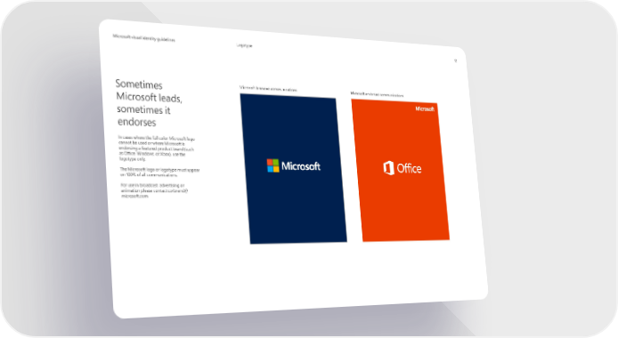 MicrMicrosoosofft visual identity guidelinest visual identity guidelines Logotype 12 Sometimes Microsoft branded communications Microsoft endorsed communications Microsoft leads, sometimes it endorses In cases where the full color Microsoft logo cannot be used or where Microsoft is endorsing a featured product brand (such as Office, Windows, or Xbox), use the logotype only. The Microsoft logo or logotype must appear on 100% of all communications. For use in broadcast advertising or animation please contact corbrand@ microsoft.com