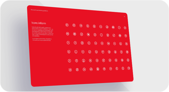 Microsoft visual identity guidelines 56 Icons inform Icons are primarily used in product as a call-to-action or quick reference. If you use an icon in marketing communications, such as an arrow as a call-to-action in a banner ad, use the same UI icons. Don’t create your own. Contact corbrand@microsoft.com for any questions. Go to Brand Tools at https://brandtools. microsoft.com to get approved icons.
