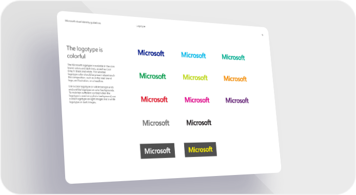 MicrMicrosoosofft visual identity guidelinest visual identity guidelines Logotype 15 The logotype is colorful The Microsoft logotype is available in the core brand colors and dark tints, as well as Cool Gray 9, black and white. The selected logotype color should be present elsewhere in the composition, such as in the lead brand logo, an illustration, or a headline. Use a color logotype on white backgrounds and a white logotype on color backgrounds. To maintain sufficient contrast when the logotype is used on a photo background, use a color logotype on light images and a white logotype on dark images.