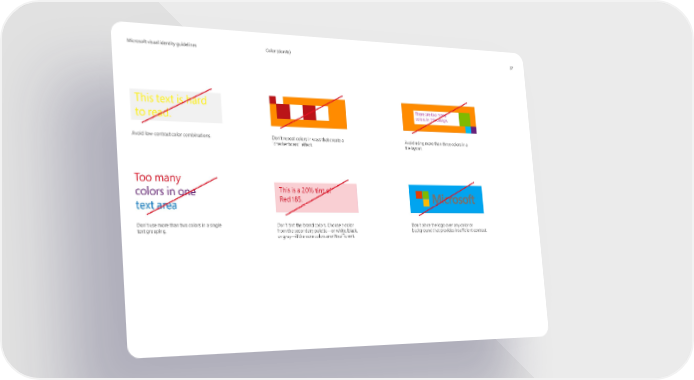 MicrMicrosoosofft visual identity guidelinest visual identity guidelines Color (don’ts) 37 This text is hard There are too many to read. colors in this design. Avoid low-contrast color combinations. Don’t repeat colors in ways that create a Avoid using more than three colors in a “checkerboard” effect. tile layout. Too many colors in one This is a 20% tint of text area Red 185. Don’t use more than two colors in a single Don’t tint the brand colors. Choose a color Don’t place the logo over any color or text grouping. from the secondary palette—or white, black, background that provides insufficient contrast. or gray—if the core colors aren’t sufficient.