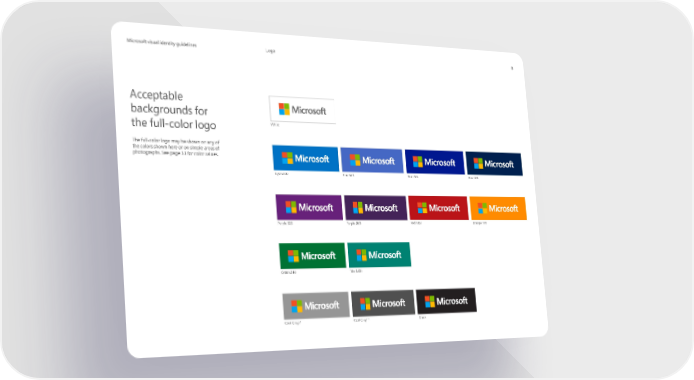 MicrMicrosoosofft visual identity guidelinest visual identity guidelines Logo 8 Acceptable backgrounds for the full-color logo White The full-color logo may be shown on any of the colors shown here or on simple areas of photographs. See page 33 for color values. Cyan 300 Blue 660 Blue 286 Blue 288 Purple 526 Purple 269 Red 1807 Orange 144 Green 348 Teal 3295 Cool Gray 7 Cool Gray 11 Black