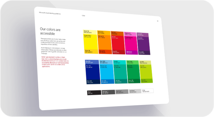 MicrMicrosoosofft visual identity guidelinest visual identity guidelines Color 34 Our colors are Yellow 100 Orange 124 Red 1665 Magenta 218 Purple 258 R255 G252 B158 R255 G185 B0 R221 G89 B0 R244 G114 B208 R155 G79 B150 accessible Process Yellow Orange 144 Red 185 Process Magenta Purple 526 R255 G241 B0 R255 G140 B0 R232 G17 B35 R236 G0 B140 R104 G33 B122 The appropriate use of color helps make sure all of our customers can access and understand Microsoft communications, regardless of their abilities. Avoid relying on color alone to convey information. Always provide text or other Yellow 116 Orange 166 Red 1807 Magenta 241 Purple 269 graphical cues to guide customers to our R252 G209 B22 R235 G60 B0 R186 G20 B26 R180 G0 B158 R68 G35 B89 message. Note: Type reversed to white, or black type over a colored background, should exceed the minimum 4.5:1 contrast ratio for Blue 660 Cyan 2985 Teal 325 Green 7480 Lime 586 accessibility. Examples at right demonstrate R70 G104 B197 R109 G194 B233 R0 G216 B204 R85 G212 B85 R226 G229 B132 correct color use for on-screen (RGB) Blue 286 Process Cyan Teal 3275 Green 355 Lime 382 applications. R0 G24 B143 R0 G188 B242 R0 G178 B148 R0 G158 B73 R186 G216 B10 Blue 288 Cyan 300 Teal 3295 Green 348 Lime 376 R0 G32 B80 R0 G114 B198 R0 G130 B114 R0 G114 B51 R127 G186 B0 Black Cool Gray 11 Cool Gray 7 Cool Gray 3 White R0 G0 B0 R80 G80 B80 R150 G150 B150 R210 G210 B210 R255 G255 B255