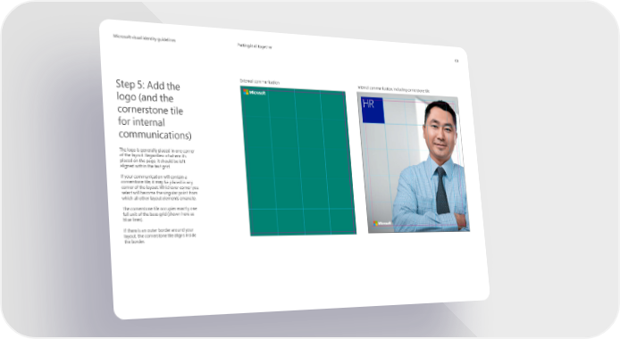 MicrMicrosoosofft visual identity guidelinest visual identity guidelines Putting it all together 63 External communication Internal communication, including cornerstone tile Step 5: Add the HR logo (and the cornerstone tile for internal communications) The logo is generally placed in one corner of the layout. Regardless of where it’s placed on the page, it should be left- aligned within the text grid. If your communication will contain a cornerstone tile, it may be placed in any corner of the layout. Whichever corner you select will become the singular point from which all other layout elements emanate. The cornerstone tile occupies exactly one full unit of the base grid (shown here as blue lines). If there is an outer border around your layout, the cornerstone tile aligns inside the border.
