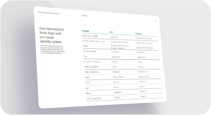 Microsoft visual identity guidelines 25 Microsoft visual identity guidelines Typography Our international Language Print On Screen fonts align with Latin, Greek, Cyrillic Segoe Pro Segoe UI (Win 8 version) our visual Hebrew, Armenian, Georgian Segoe UI (Win 8 version) Segoe UI (Win 8 version) identity system Segoe UI (Win 8 version) We recommend specific fonts for use Arabic Majalla “Traditional” Segoe UI (Win 8 version) around the world. If subsidiaries have identified alternate third party fonts Indian languages Nirmala UI Nirmala UI they feel align better with Segoe please contact [email protected]. Thai Leelawadee Leelawadee Indiginios American Gadugi Gadugi China (simplified) YaHei YaHei UI China (traditional) JhengHei JhengHei UI Korea Malgun Gothic Malgun Gothic Japan Meiryo Meiryo UI Lao Lao UI Lao UI Khmer DaunPenh Khmer UI African languages Ebrima Ebrima