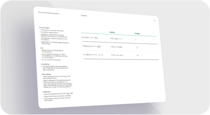 MicrMicrosoosofft visual identity guidelinest visual identity guidelines Typography 24 Size and weight Leading Tracking • Limit type to no more than three sizes. • Use Light for large headlines. • Use Regular or Semibold for increased Body text (<8~14pt) 120% (minimum) 0 legibility at small sizes or over backgrounds. • Use Semibold or Bold for subheads, but not for headlines. • Segoe Black or Condensed weights should be used sparingly. Subhead text (14~36pt) 110% (minimum) -15 Case • Sentence case is our standard for all communications. Headline text (36~72pt+) 120% (maximum) -15 • Use all-uppercase sparingly—for titles, short headings, or subheadings, and never for full paragraphs. • Do not use all-lowercase type. Line spacing • Line spacing refers to the space between lines of type. See the chart at right for line spacing guidelines. Letter spacing • Letter spacing (also known as tracking) is the space between letters. • Segoe is designed so that letter spacing and word spacing are set by default to 0. In some cases, spacing may need to be adjusted. Make sure that letters never touch one another. See the chart at right for tracking guidelines. Justification • Type should always be set flush left, ragged right. • Segoe should never be justified or centered. • Avoid widows, orphans, and lines that end with hyphens