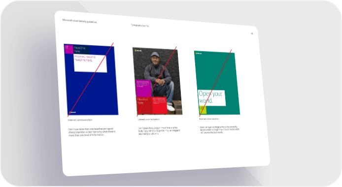 MicrMicrosoosofft visual identity guidelinest visual identity guidelines Typography (don’ts) 30 IT Headline here. Incorrect second headline here. Entil aut eos cor aut porro id exerup fugia dicatur? Kuiae pliscid quod quia doluptatur modiscidem volup taque aboresequis nihicim comnis cus qua mil ex et es aut et Open your Sentis aut eos cor aut porro id exerid Headline fugia dicatur? Quiae pliscid quod quis soluptatur modiscidem voluptaque por world. aboresequis nihicim comnis cus duam here. mil ex et es aut et HR Internal communication External communication Internal communication Don’t use more than one headline per layout. Don’t place body copy in more than one tile. Don’t set type too large within a tile. Generally, Always maintain a clear hierarchy when there is Body copy within a single tile may be arragned headline text no larger than 75% of the tile width more than one level of information. into multiple columns. will provide the best results.