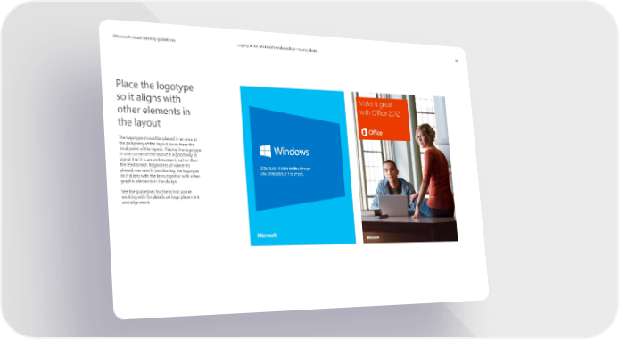 MicrMicrosoosofft visual identity guidelinest visual identity guidelines Logotype for Microsoft-endorsed communications 18 Place the logotype Make it great so it aligns with with Office 2012. other elements in the layout The logotype should be placed in an area at the periphery of the layout, away from the focal point of the layout. Placing the logotype in one corner of the layout is a good way to signal that it is an endorsement, rather than the lead brand. Regardless of where it’s Stay even closer to the things placed, use care in positioning the logotype you care about the most. so it aligns with the layout grid or with other graphic elements in the design. See the guidelines for the brand you’re working with for details on logo placement and alignment.