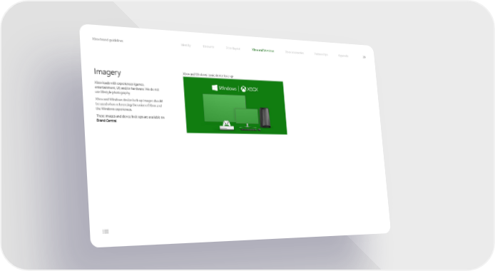 Xbox brand guidelines Identity Elements Xbox layout Xbox and Windows Xbox accessories Partnerships Appendix 29 Imagery Xbox and Windows iconic device lock-up Xbox leads with experiences (games, entertainment, UI) and/or hardware. We do not use lifestyle photography. Xbox and Windows device lock-up images should be used when referencing the union of Xbox and the Windows experiences. These images and device lock-ups are available on Brand Central.