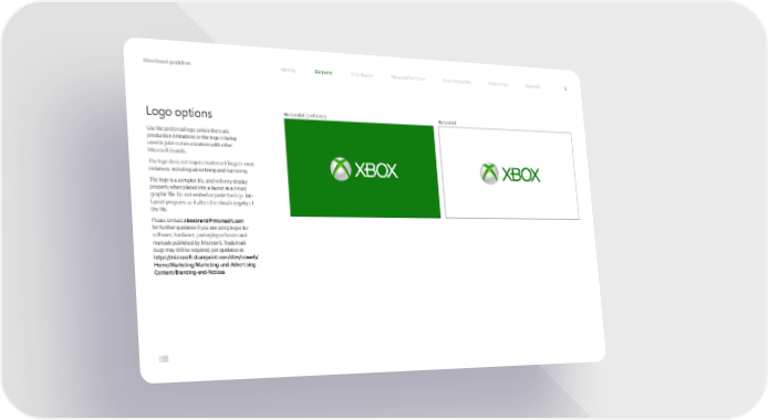Xbox brand guidelines Identity Elements Xbox layout Xbox and Windows Xbox accessories Partnerships Appendix 12 Logo options HHoorriizzoonnttaall (preferred) Horizontal Use the preferred logo unless there are production limitations or the logo is being used in joint communications with other Microsoft brands. The logo does not require trademark bugs in most instances, including advertising and marketing. The logo is a complex file, and will only display properly when placed into a layout as a linked graphic file. Do not embed or paste the logo into layout programs as it alters the visual integrity of the file. Please contact [email protected] for further guidance if you are using logos for software, hardware, packaging or books and manuals published by Microsoft. Trademark bugs may still be required, per guidance at https://microsoft.sharepoint.com/sites/lcaweb/ Home/Marketing/Marketing-and-Advertising- Content/Branding-and-Notices