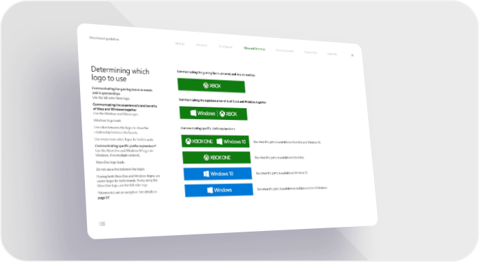 Xbox brand guidelines Identity Elements Xbox layout Xbox and Windows Xbox accessories Partnerships Appendix 26 Determining which Communicating the gaming brand at events and in sponsorships logo to use Communicating the gaming brand at events and in sponsorships Use the full color Xbox logo. Communicating the experience/benefits of Xbox and Windows together Communicating the experience/brand benefits of Xbox and Windows together Use the Windows and Xbox logos. Windows logo leads. Use a line between the logos to show the Communicating specific platforms/versions relationship between the brands. Use vector (one color) logos for both brands. Use when the game is available on Xbox One and Windows 10. Communicating specific platforms/versions* Use the Xbox One and Windows 10 logos (or Windows, if on multiple versions). Use when the game is available on Xbox One. Xbox One logo leads. Do not use a line between the logos. If using both Xbox One and Windows logos, use Use when the game is available on Windows 10. vector logos for both brands. If only using the Xbox One logo, use the full color logo. *Mnemonics are an exception. See details on Use when the game is available on multiple versions of Windows. page 37.