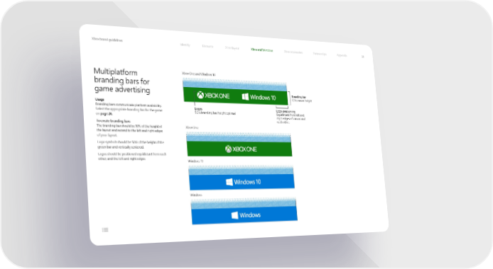 Xbox brand guidelines Identity Elements Xbox layout Xbox and Windows Xbox accessories Partnerships Appendix 31 Multiplatform Xbox One and Windows 10 branding bars for game advertising Branding bar 10% canvas height Usage Branding bars communicate platform availability. Logos Logo positioning Select the appropriate branding bar for the game 50% branding bar height optimal Equidistant from left and on page 26. right edges of canvas and To create branding bars each other. The branding bar should be 10% of the height of Xbox One the layout and extend to the left and right edges of your layout. Logo symbols should be 50% of the height of the green bar and vertically centered. Logos should be positioned equidistant from each other, and the left and right edges. Windows 10 Windows