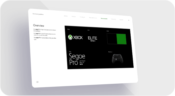 XboXbox brand guidelinesx brand guidelines IIddeentntiittyy EEllememenenttss XXbboox lax layyooutut XXbbooxx a anndd W Wiinnddoowsws XbXbooxx ac accceessssoorriieess PPaarrttnneerrsshhiippss ApApppendendiixx 4242 Overview Logo Icon Color See page 13 for logo clear space and minimum size guidance. See page 15 for specific black and green color values to use with Xbox Elite. See page 17 for type guidance. Only use white type. Type Hardware SemiLight Regular Bold