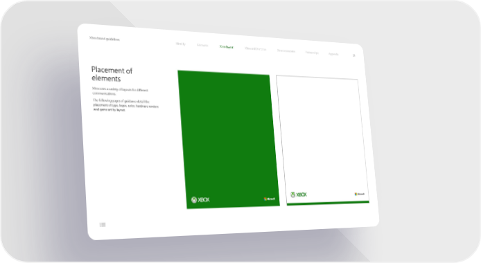 Xbox brand guidelines Identity Elements Xbox layout Xbox and Windows Xbox accessories Partnerships Appendix 21 Placement of elements Xbox uses a variety of layouts for different communications. The following pages of guidance detail the placement of type, logos, color, hardware renders and game art by layout.