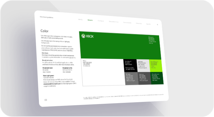 Xbox brand guidelines Identity Elements Xbox layout Xbox and Windows Xbox accessories Partnerships Appendix 15 Color Xbox green R16 G124 B16 Use white type when using green, rich black, mid gray, HEX #107C10 dark gray or light green backgrounds. C75 M0 Y100 K0 PMS 362 Use mid gray type when using white or light gray backgrounds. Do not use the automated color-conversion tools in your software. Each color has been optimized for print reproduction (PMS/CMYK) and on-screen (RGB/HEX). Rich black Rich black should be applied when a black background is needed on print deliverables. Do not use in typography. Broadcast colors White Black (digital) Light gray Xbox light green For all broadcast TV, UI and dash applications, white R255 G255 B255 R0 G0 B0 R230 G230 B230 R155 G240 B11 and black should use these alternate broadcast colors. HEX #FFFFFF HEX #000000 HEX #E6E6E6 HEX #9bf00b C0 M0 Y0 K0 C0 M0 Y0 K10 *CMYK Broadcast black Broadcast white Rich Black (print) PMS Cool Gray 1C PMS 375C R0 G0 B0 R235 G235 B235 C60 M40 Y40 K100 HEX #101010 HEX #EBEBEB Xbox Light green Mid gray Dark gray Xbox dark green *C44 M0 Y100 K0 R115 G115 B115 R80 G80 B80 R5 G75 B22 Print should always use PMS values for Xbox Light HEX #737373 HEX #505050 HEX #054b16 C0 M0 Y0 K65 C0 M0 Y0 K80 C95 M25 Y85 K65 Green. Do not use when PMS is not available. Contact PMS Cool Gray 9 PMS Cool Gray 11 PMS 3435C [email protected] for Xbox light green CMYK usage in small areas. The colors, CMYK, RGB, and hexadecimal breakdowns shown here have not been evaluated by PANTONE for accuracy and may not match the PANTONE Color Standard. Consult current PANTONE Color Publications for accurate color. PANTONEĀ® is the property of Pantone LLC.