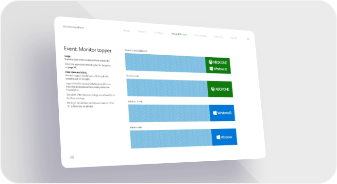 Xbox brand guidelines Identity Elements Xbox layout Xbox and Windows Xbox accessories Partnerships Appendix 38 Event: Monitor topper Xbox One and Windows 10 Usage Branding bars communicate platform availability. Select the appropriate branding bar for the game on page 26. Clear space and sizing Xbox One only Monitor toppers should have a 75/25 split with branding bar on the right. Logos should be stacked with Windows 10 below Xbox One and centered horizontally within the branding bar. The width of the Windows 10 logo should be 97% of the Xbox One logo. The logos should have a minimum clearance of the Windows 10 only “X” in Xbox One on all sides. Windows only