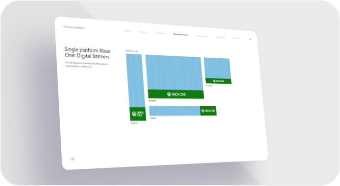 Xbox brand guidelines Identity Elements Xbox layout Xbox and Windows Xbox accessories Partnerships Appendix 34 Single platform Xbox Xbox One only One: Digital Banners Use the Xbox One branding bar if the game is only available on Xbox One. 300x250 600x400 728x90 160x600