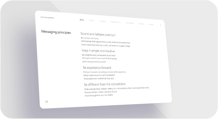 Xbox brand guidelines Identity Elements Xbox layout Xbox and Windows Xbox accessories Partnerships Appendix 6 Messaging principles Sound and behave premium Be confident and iconic. Use language that suggests high-quality, extraordinary experiences. Avoid overselling, boasting, clichés, and words that suggest “cheap.” Keep it simple and intuitive Be straightforward, conversational, and brief. Know your audience and speak their language. Avoid every unnecessary word. Be experience forward Embrace the most compelling moments of the experience. Use an active voice that pulls the reader in. Avoid passive and mechanical language. Be different from the competition Write uniquely Xbox. Be bold, inviting, fun, and premium, without ever saying those words. Provoke emotion. Desire. Curiosity. Delight. Avoid being generic, soulless, neutral.