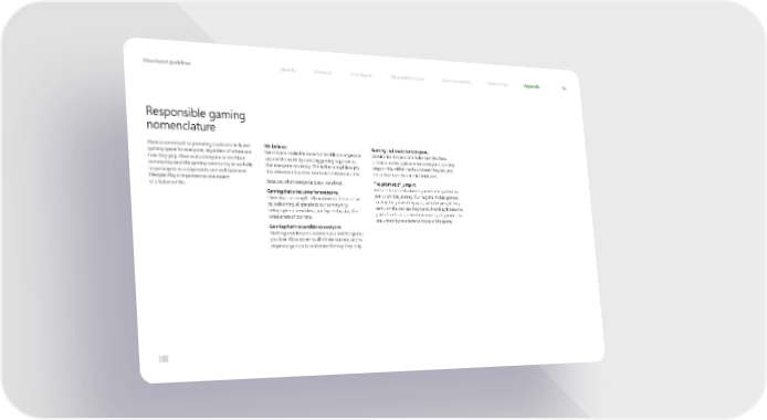 Xbox brand guidelines Identity Elements Xbox layout Xbox and Windows Xbox accessories Partnerships Appendix 56 Responsible gaming nomenclature Xbox is committed to providing a safe and inclusive We believe: Gaming that’s safe for everyone. gaming space for everyone, regardless of where and We strive to make life more fun for billions of people Gaming is a fun part of a balanced life. Xbox how they play. Xbox wants everyone in the Xbox around the world by creating gaming experiences strives to create a place where everyone can play community (and the gaming community as a whole) that everyone can enjoy. This is the core philosophy responsibly, within the boundaries they set, and to participate in a responsible and well-balanced that drives our business, our brand and our actions. do so free from fear and intimidation. lifestyle. Play is important as one aspect Because, when everyone plays, we all win. The promise of jump in: of a balanced life. Jump in is our invitation to gamers everywhere to Gaming that’s inclusive for everyone. join us on this journey. Our tagline invites gamers Diversity is a strength. Xbox strives to be inclusive to play the games they want, with the people they by welcoming all people to our community, want, on the devices they want. And they’ll become being open to new ideas, and by celebrating the part of a vibrant, diverse community of gamers that uniqueness of our fans. are united by our common love of the game. Gaming that’s accessible to everyone Nothing should come between you and the games you love. Xbox strives to eliminate barriers, and to empower gamers to customize the way they play.