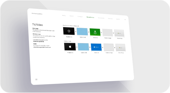 Xbox brand guidelines Identity Elements Xbox layout Xbox and Windows Xbox accessories Partnerships Appendix 37 TV/Video Xbox One, Xbox One and Windows 10 Xbox usage The sphere is in the intro and Xbox logo is used + + + + in the mnemonic. Windows usage The symbol is in the intro and the platform logo Branded intro Game content Mnemonic Business message Microsoft logo is used in the mnemonic. Find additional guidance in the Windows 10 only Mnemonic guidelines Assets For mnemonic asset help, contact: + + + + [email protected] Branded intro Game content Mnemonic Business message Microsoft logo