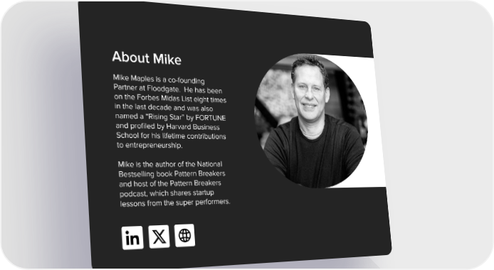 About Mike Mike Maples is a co-founding Partner at Floodgate. He has been on the Forbes Midas List eight times in the last decade and was also named a “Rising Star” by FORTUNE and profiled by Harvard Business School for his lifetime contributions to entrepreneurship. Mike is the author of the National Bestselling book Pattern Breakers and host of the Pattern Breakers podcast, which shares startup lessons from the super performers.