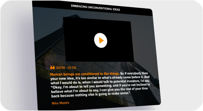 EMBRASUSCING UNCONVENTIONAL IDEATAINABLE PROFITABILITY S 1. Domestic & General started out over 100 years ago, ensuring cattle and sheep rights. So not long after the Titanic went down there was a need all of a sudden to have protection and insurance on your livestock. (02:56 - 03:20) Human beings are conditioned to like things. So if everybody likes your new idea, it's too similar to what's already come before it. And what I would do is, when I would talk to potential investors, I'd say, “Okay, I'm about to tell you something, and if you're not inclined to believe what I'm about to say, I can give you the rest of your time back because nothing else is going to make sense.” Mike Maples