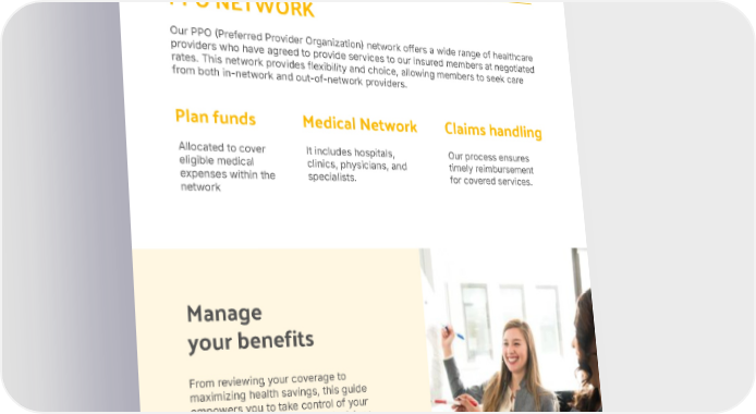 Medical Benefits PPO NETWORK Our PPO Preferred Provider Organization) network offers a wide range of healthcare providers who have agreed to provide services to our insured members at negotiated rates. This network provides flexibility and choice, allowing members to seek care from both in-network and out-of-network providers. Plan funds Medical Network Claims handling Allocated to cover It includes hospitals, Our process ensures eligible medical clinics, physicians, and timely reimbursement expenses within the specialists. for covered services. network Manage your benefits From reviewing your coverage to maximizing health savings, this guide empowers you to take control of your benefits and make informed decisions about your healthcare needs. ✔ Review Your Coverage ✔ Utilize Preventive Services ✔ Monitor Your Claims ✔ Maximize Health Savings ✔ Stay Informed