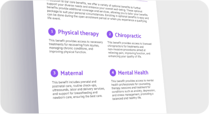 Optional Benefits In addition to our core benefits, we offer a variety of optional benefits to further support your diverse needs and enhance your overall well-being. These optional benefits provide additional coverage and services, allowing you to tailor your benefits package to suit your personal circumstances. Enrolling in optional benefits is easy and can be done during the open enrollment period or when you experience a qualifying life event. 1 2 Physical therapy Chiropractic This benefit provides access to necessary This benefit provides access to licensed treatments for recovering from injuries, chiropractors for treatments and managing chronic conditions, and non-invasive procedures aimed at improving physical function. relieving pain, improving function, and enhancing your quality of life. 3 4 Maternal Mental Health This benefit includes prenatal and This benefit provides access to mental postnatal care, routine check-ups, health professionals for counseling, ultrasounds, labor and delivery services, therapy sessions and treatment for and support for breastfeeding and conditions such as anxiety, depression, newborn care, ensuring the best care. and stress management, promoting a balanced and healthy life.