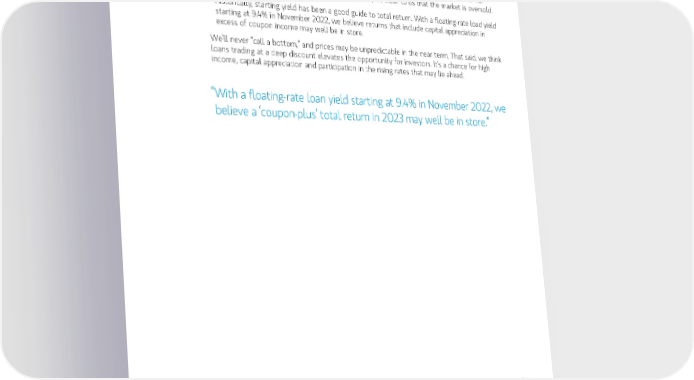 24 | 2023 Investment Outlook | December 12, 2022 ƒ For context, that figure is almost double the great financial crisis of 2008, and about five times the deep (albeit short) COVID recession. By contrast, the current default rate is below 1%. Though we expect annual levels to rise somewhat, it’s clear to us that the market is oversold. ƒ Historically, starting yield has been a good guide to total return. With a floating-rate load yield starting at 9.4% in November 2022, we believe returns that include capital appreciation in excess of coupon income may well be in store. We’ll never “call a bottom,” and prices may be unpredictable in the near term. That said, we think loans trading at a deep discount elevates the opportunity for investors. It’s a chance for high income, capital appreciation and participation in the rising rates that may lie ahead. “With a floating-rate loan yield starting at 9.4% in November 2022, we believe a ‘coupon-plus’ total return in 2023 may well be in store.” The index performance is provided for illustrative purposes only and is not meant to depict the performance of a specific investment. Past performance is no guarantee of future results. See Disclosure section for index definitions. Risk Considerations: Loans are traded in a private, unregulated inter-dealer or inter-bank resale market and are generally subject to contractual restrictions that must be satisfied before a loan can be bought or sold. These restrictions may impede the strategy's ability to buy or sell loans (thus affecting their liquidity) and may negatively impact the transaction price. It may take longer than seven days for transactions in loans to settle. Due to the possibility of an extended loan settlement process, the strategy may hold cash, sell investments or temporarily borrow from banks or other lenders to meet short-term liquidity needs. Loans may be structured such that they are not securities under securities law, and in the event of fraud or misrepresentation by a borrower, lenders may not have the protection of the anti-fraud provisions of the federal securities laws. Loans are also subject to risks associated with other types of income like high-yield bonds described above. Investments in foreign instruments or currencies can involve greater risk and volatility than U.S. investments because of adverse market, economic, political, regulatory, geopolitical, currency exchange rates or other conditions. Changes in the value of investments entered for hedging purposes may not match those of the position being hedged.