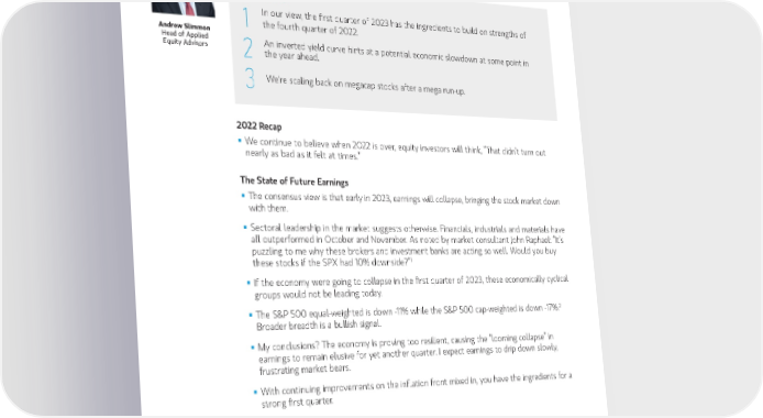 3 | 2023 Investment Outlook | December 12, 2022 EQUITY We See A Resilient Economy Without a Looming Collapse KEY POINTS In our view, the first quarter of 2023 has the ingredients to build on strengths of 1 the fourth quarter of 2022. Andrew Slimmon Head of Applied An inverted yield curve hints at a potential economic slowdown at some point in Equity Advisors 2 the year ahead. 3 We're scaling back on megacap stocks after a mega run-up. 2022 Recap ƒ We continue to believe when 2022 is over, equity investors will think, “That didn’t turn out nearly as bad as it felt at times.” The State of Future Earnings ƒ The consensus view is that early in 2023, earnings will collapse, bringing the stock market down with them. ƒ Sectoral leadership in the market suggests otherwise. Financials, industrials and materials have all outperformed in October and November. As noted by market consultant John Raphael: “It’s puzzling to me why these brokers and investment banks are acting so well. Would you buy 1 these stocks if the SPX had 10% downside?” ƒ If the economy were going to collapse in the first quarter of 2023, these economically cyclical groups would not be leading today. 2 ƒ The S&P 500 equal-weighted is down -11% while the S&P 500 cap-weighted is down -17%. Broader breadth is a bullish signal. ƒ My conclusions? The economy is proving too resilient, causing the “looming collapse” in earnings to remain elusive for yet another quarter. I expect earnings to drip down slowly, frustrating market bears. ƒ With continuing improvements on the inflation front mixed in, you have the ingredients for a strong first quarter. What We Can Learn from Yield Curves ƒ Yield curves are inverted (when interest rates on long-term bonds fall lower than those of short-term bonds), a fact that requires attention and respect. ƒ Yield curves are not very good at predicting when a slowdown occurs, only that it will occur at some point in the future. ƒ Could the scenario of a weaker second half following a surprisingly strong first half occur in 2023? Said another way, could the narrative change to “weakness in the market–but from higher levels?” Maybe, but that is not the consensus.