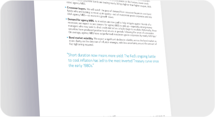 28 | 2023 Investment Outlook | December 12, 2022 What We Are Watching ƒ MBS spreads. Spreads are wide relative to other fixed income sectors, such as investment- grade corporates. Despite increasing concerns of a recession on the horizon, lower credit quality, A-rated corporate bonds are trading nearly 30 bps tighter than higher-coupon, AAA- rated agency MBS. ƒ Crossover buyers. We will watch the pace of demand from crossover buyers in core bond funds who are looking to move up in quality—out of investment-grade corporates and into AAA agency MBS—as economic growth slows. ƒ Demand for agency MBS. As investors are now paid to help mitigate against the risk of a recession, we expect to see demand for agency MBS to pick up—especially among money managers who may seek to shed credit risk before defaults begin to escalate. Historically, these securities have produced positive total returns in periods following the onset of a recession. 2 On average, agency MBS have outperformed investment-grade corporates by nearly 400 bps. ƒ Bond market volatility. We expect a significant decline in volatility across the bond market as more clarity on the direction of inflation emerges, with less uncertainty around the amount of Fed tightening required. “Short duration now means more yield: The Fed’s ongoing battle to cool inflation has led to the most inverted Treasury curve since the early 1980s.” 1 Convexity measures the sensitivity of a bond’s duration to changes in yield. 2 Source: Bloomberg. Agency MBS represented by the ICE BofA MBS Index, investment-grade corporates represented by the ICE BofA US Corporate Index; measured over six recessions since the creation of MBS in the late 1970s, from 1980 to 2020. The index performance is provided for illustrative purposes only and is not meant to depict the performance of a specific investment. Past performance is no guarantee of future results. See Disclosure section for index definitions. Risk Considerations: The value of investments may increase or decrease in response to economic, and financial events (whether real, expected or perceived) in the U.S. and global markets. Securities with longer durations tend to be more sensitive to interest-rate changes than securities with shorter durations. As interest rates rise, the value of certain income investments is likely to decline. Mortgage- and asset-backed securities are subject to credit, interest rate, prepayment and extension risk. Investments in debt instruments may be affected by changes in the creditworthiness of the issuer and are subject to the risk of non-payment of principal and interest. The value of income securities also may decline because of real or perceived concerns about the issuer's ability to make principal and interest payments. U.S. Treasury securities generally have a lower return than other obligations because of their higher credit quality and market liquidity. While certain U.S. government- sponsored agencies may be chartered or sponsored by acts of Congress, their securities are neither issued nor guaranteed by the U.S. Treasury.