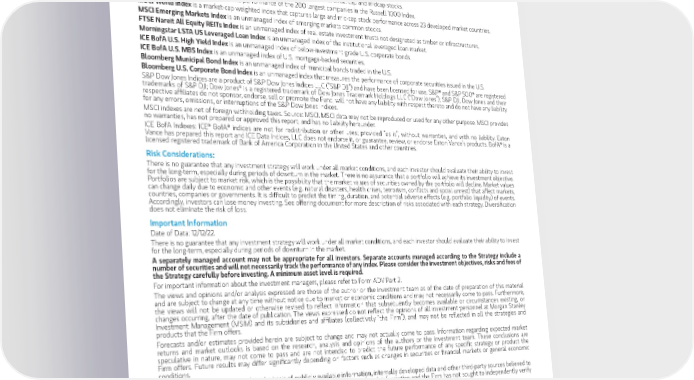 37 | 2023 Investment Outlook | December 12, 2022 INDEX DEFINITIONS S&P 500® Index is an unmanaged index of large cap stocks commonly used as a measure of U.S. stock market performance. Russell 1000® Value Index is an unmanaged index of U.S. large cap value stocks. Russell 1000® Growth Index is an unmanaged index of U.S. large cap growth stocks. Russell 1000® Index is an unmanaged index of 1,000 U.S. large-cap stocks. Russell 2000® Index is an unmanaged index of 2,000 U.S. small-cap stocks. Russell 2500® Index is an unmanaged index of approximately 2,500 U.S. small-cap and midcap stocks. Russell Top 200 Index measures the performance of the 200 largest companies in the Russell 1000 Index. MSCI World Index is a market-cap weighted index that captures large and mid-cap stock performance across 23 developed market countries. MSCI Emerging Markets Index is an unmanaged index of emerging markets common stocks. FTSE Nareit All Equity REITs Index is an unmanaged index of real estate investment trusts not designated as timber or infrastructures. Morningstar LSTA US Leveraged Loan Index is an unmanaged index of the institutional leveraged loan market. ICE BofA U.S. High Yield Index is an unmanaged index of below-investment grade U.S. corporate bonds. ICE BofA U.S. MBS Index is an unmanaged index of U.S. mortgage-backed securities. Bloomberg Municipal Bond Index is an unmanaged index of municipal bonds traded in the U.S. Bloomberg U.S. Corporate Bond Index is an unmanaged index that measures the performance of corporate securities issued in the U.S. S&P Dow Jones Indices are a product of S&P Dow Jones Indices LLC (“S&P DJI”) and have been licensed for use. S&P® and S&P 500® are registered trademarks of S&P DJI; Dow Jones® is a registered trademark of Dow Jones Trademark Holdings LLC (“Dow Jones”); S&P DJI, Dow Jones and their respective affiliates do not sponsor, endorse, sell or promote the Fund, will not have any liability with respect thereto and do not have any liability for any errors, omissions, or interruptions of the S&P Dow Jones Indices. MSCI indexes are net of foreign withholding taxes. Source: MSCI. MSCI data may not be reproduced or used for any other purpose. MSCI provides no warranties, has not prepared or approved this report, and has no liability hereunder. ICE BofA Indexes: ICE® BofA® indices are not for redistribution or other uses; provided “as is”, without warranties, and with no liability. Eaton Vance has prepared this report and ICE Data Indices, LLC does not endorse it, or guarantee, review, or endorse Eaton Vance’s products. BofA® is a licensed registered trademark of Bank of America Corporation in the United States and other countries. Risk Considerations: There is no guarantee that any investment strategy will work under all market conditions, and each investor should evaluate their ability to invest for the long-term, especially during periods of downturn in the market. There is no assurance that a portfolio will achieve its investment objective. Portfolios are subject to market risk, which is the possibility that the market values of securities owned by the portfolio will decline. Market values can change daily due to economic and other events (e.g. natural disasters, health crises, terrorism, conflicts and social unrest) that affect markets, countries, companies or governments. It is difficult to predict the timing, duration, and potential adverse effects (e.g. portfolio liquidity) of events. Accordingly, investors can lose money investing. See offering document for more description of risks associated with each strategy. Diversification does not eliminate the risk of loss. Important Information Date of Data: 12/12/22. There is no guarantee that any investment strategy will work under all market conditions, and each investor should evaluate their ability to invest for the long-term, especially during periods of downturn in the market. A separately managed account may not be appropriate for all investors. Separate accounts managed according to the Strategy include a number of securities and will not necessarily track the performance of any index. Please consider the investment objectives, risks and fees of the Strategy carefully before investing. A minimum asset level is required. For important information about the investment managers, please refer to Form ADV Part 2. The views and opinions and/or analysis expressed are those of the author or the investment team as of the date of preparation of this material and are subject to change at any time without notice due to market or economic conditions and may not necessarily come to pass. Furthermore, the views will not be updated or otherwise revised to reflect information that subsequently becomes available or circumstances existing, or changes occurring, after the date of publication. The views expressed do not reflect the opinions of all investment personnel at Morgan Stanley Investment Management (MSIM) and its subsidiaries and affiliates (collectively “the Firm”), and may not be reflected in all the strategies and products that the Firm offers. Forecasts and/or estimates provided herein are subject to change and may not actually come to pass. Information regarding expected market returns and market outlooks is based on the research, analysis and opinions of the authors or the investment team. These conclusions are speculative in nature, may not come to pass and are not intended to predict the future performance of any specific strategy or product the Firm offers. Future results may differ significantly depending on factors such as changes in securities or financial markets or general economic conditions. This material has been prepared on the basis of publicly available information, internally developed data and other third-party sources believed to be reliable. However, no assurances are provided regarding the reliability of such information and the Firm has not sought to independently v