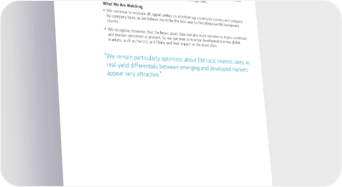 30 | 2023 Investment Outlook | December 12, 2022 ƒ Most recently, we have also been adding selectively to our positioning in EM currencies, where compensation appears comparatively attractive, given the level of risk. On the hard currency side, we maintain a slight preference for EM corporate over sovereign debt. What We Are Watching ƒ We continue to evaluate all opportunities on a bottom-up, country-by-country and company- by-company basis, as we believe this to be the best way to find attractive EM turnaround stories. ƒ We recognize, however, that the broad asset class remains more sensitive to macro conditions and market sentiment at present. So we continue to monitor developments in key global markets, such as the U.S. and China, and their impact on the asset class. “We remain particularly optimistic about EM local interest rates, as real yield differentials between emerging and developed markets appear very attractive.” 1 J.P. Morgan, Global Emerging Markets Research: EM Flows Weekly, November 18, 2022. Risk Considerations: The value of investments may increase or decrease in response to economic and financial events (whether real or perceived) in the U.S. and global markets. The strategy employs an "absolute return" investment approach, benchmarking itself to an index of cash instruments and seeking to achieve returns that are largely independent of broad movements in stocks and bonds. Investments in foreign instruments or currencies can involve greater risk and volatility than U.S. investments because of adverse market, economic, political, regulatory, geopolitical, currency exchange rates or other conditions. In emerging or frontier countries, these risks may be more significant. Investments in debt instruments may be affected by changes in the creditworthiness of the issuer and are subject to the risk of non-payment of principal and interest. The value of income securities also may decline because of real or perceived concerns about the issuer's ability to make principal and interest payments. Exposure to derivatives involves risks different from, or possibly greater than, the risks associated with investing directly in securities and other investments. As interest rates rise, the value of certain income investments is likely to decline. The value of commodities investments will generally be affected by overall market movements and factors specific to a particular industry or commodity, including weather, embargoes, tariffs, or health, political, international and regulatory developments.