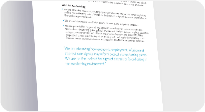 34 | 2023 Investment Outlook | December 12, 2022 ƒ We are taking advantage of the arbitrage between public and private markets and funds in need of liquidity. We are seeking the highest quality assets that meet post-COVID-19 occupier requirements. We are looking to leverage asset management expertise to drive income growth. Moreover, we are targeting ESG retrofit opportunities to optimize asset energy efficiencies. What We Are Watching ƒ We are observing how economic, employment, inflation and interest rate signals may inform cyclical market turning points. We are on the lookout for signs of distress or forced selling in the weakening environment. ƒ We are anticipating increased M&A activity between public and private companies. ƒ We see potential for heightened regulatory risks—such as rent control and real estate taxes—from the shifting global political environment. We have our eyes on global dislocation, divergent recovery cycles and different opportunities by region and market. U.S./China geopolitical tensions and the impact on global growth and supply chains continue to add pressure across equities, and we are waiting to see how that impacts private real estate. “We are observing how economic, employment, inflation and interest rate signals may inform cyclical market turning points. We are on the lookout for signs of distress or forced selling in the weakening environment.” Risk Considerations: Historical performance information is not indicative of future results. Alternative investments are speculative and include a high degree of risk. Investors could lose all, or a substantial amount, of their investment. Alternative instruments are suitable only for long-term investors willing to forgo liquidity and put capital at risk for an indefinite period of time. Alternative investments are typically highly illiquid— there is no secondary market for private funds, and there may be restrictions on redemptions or the assignment or other transfer of investments in private funds. Alternative investments often utilize leverage and other speculative practices that may increase volatility and risk of loss. Financial intermediaries are required to satisfy themselves that the information in this document is suitable for any person to whom they provide this document in view of that person’s circumstances and purpose. Morgan Stanley Investment Management (MSIM), its affiliates and its and their respective directors, officers, members, partners, employees, agents, advisors, representatives, heirs and successors shall have no liability whatsoever with respect to any person’s or entity’s receipt, use of or reliance upon this document or any information contained herein. If such a person considers an investment, she/he should always ensure that she/he has satisfied herself/himself that she/he has been properly advised by that financial intermediary about the suitability of an investment.