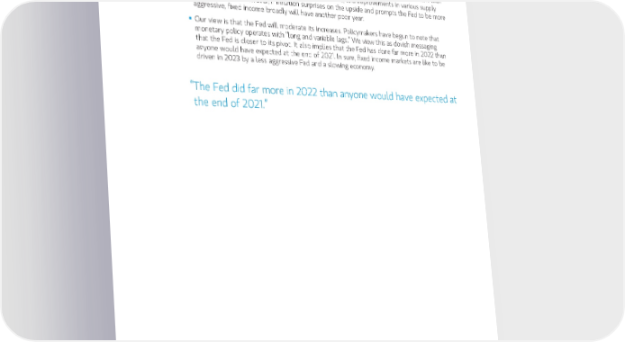 8 | 2023 Investment Outlook | December 12, 2022 ƒ It’s worth stressing that the most important variable looking forward is what inflation will be over the medium term. We believe that inflation will continue to come down consistent with a slowdown in demand as the U.S. economy weakens, and improvements in various supply side constraints. However, if inflation surprises on the upside and prompts the Fed to be more aggressive, fixed income broadly will have another poor year. ƒ Our view is that the Fed will moderate its increases. Policymakers have begun to note that monetary policy operates with “long and variable lags.” We view this as dovish messaging that the Fed is closer to its pivot. It also implies that the Fed has done far more in 2022 than anyone would have expected at the end of 2021. In sum, fixed income markets are like to be driven in 2023 by a less aggressive Fed and a slowing economy. “The Fed did far more in 2022 than anyone would have expected at the end of 2021.” Risk Considerations: An imbalance in supply and demand in the income market may result in valuation uncertainties and greater volatility, less liquidity, widening credit spreads and a lack of price transparency in the market. There can be no assurance that the liquidation of collateral securing an investment will satisfy the issuer’s obligation in the event of non-payment, or that collateral can be readily liquidated. The ability to realize the benefits of any collateral may be delayed or limited. Investments in income securities may be affected by changes in the creditworthiness of the issuer and are subject to the risk of non-payment of principal and interest. The value of income securities also may decline because of real or perceived concerns about the issuer’s ability to make principal and interest payments. Investments rated below investment grade (typically referred to as “junk”) are generally subject to greater price volatility and illiquidity than higher-rated investments. As interest rates rise, the value of certain income investments is likely to decline. Bank loans are subject to pre-payment risk. ESG - There is no assurance strategies that incorporate ESG factors will result in more favorable investment performance.