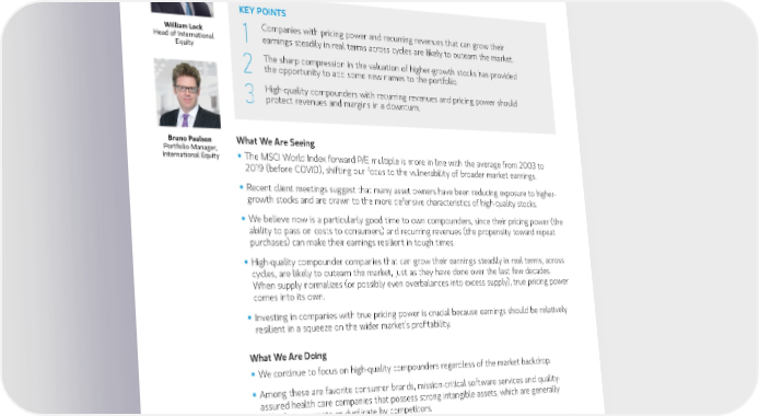 17 | 2023 Investment Outlook | December 12, 2022 INTERNATIONAL EQUITY High-Quality Compounders Offer Recurring Revenues and Pricing Power KEY POINTS William Lock Companies with pricing power and recurring revenues that can grow their Head of International 1 earnings steadily in real terms across cycles are likely to outearn the market. Equity The sharp compression in the valuation of higher-growth stocks has provided 2 the opportunity to add some new names to the portfolio. High-quality compounders with recurring revenues and pricing power should 3 protect revenues and margins in a downturn. Bruno Paulson What We Are Seeing Portfolio Manager, International Equity ƒ The MSCI World Index forward P/E multiple is more in line with the average from 2003 to 2019 (before COVID), shifting our focus to the vulnerability of broader market earnings. ƒ Recent client meetings suggest that many asset owners have been reducing exposure to higher- growth stocks and are drawn to the more defensive characteristics of high-quality stocks. ƒ We believe now is a particularly good time to own compounders, since their pricing power (the ability to pass on costs to consumers) and recurring revenues (the propensity toward repeat purchases) can make their earnings resilient in tough times. ƒ High-quality compounder companies that can grow their earnings steadily in real terms, across cycles, are likely to outearn the market, just as they have done over the last few decades. When supply normalizes (or possibly even overbalances into excess supply), true pricing power comes into its own. ƒ Investing in companies with true pricing power is crucial because earnings should be relatively resilient in a squeeze on the wider market’s profitability. What We Are Doing ƒ We continue to focus on high-quality compounders regardless of the market backdrop. ƒ Among these are favorite consumer brands, mission-critical software services and quality- assured health care companies that possess strong intangible assets, which are generally difficult to recreate or duplicate by competitors. ƒ The sharp compression in the valuation of higher-growth stocks has provided the opportunity to add some new names to the portfolio and has influenced the additions and reductions within our global portfolios this past year.
