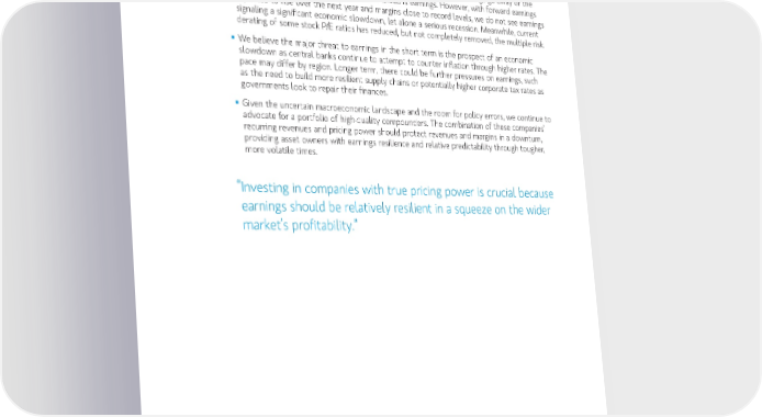 18 | 2023 Investment Outlook | December 12, 2022 What We Are Watching ƒ There are two ways of losing money in equity investing: either the earnings go away or the multiple goes away. The main risk we see ahead is earnings. However, with forward earnings expected to rise over the next year and margins close to record levels, we do not see earnings signaling a significant economic slowdown, let alone a serious recession. Meanwhile, current derating of some stock P/E ratios has reduced, but not completely removed, the multiple risk. ƒ We believe the major threat to earnings in the short term is the prospect of an economic slowdown as central banks continue to attempt to counter inflation through higher rates. The pace may differ by region. Longer term, there could be further pressures on earnings, such as the need to build more resilient supply chains or potentially higher corporate tax rates as governments look to repair their finances. ƒ Given the uncertain macroeconomic landscape and the room for policy errors, we continue to advocate for a portfolio of high-quality compounders. The combination of these companies’ recurring revenues and pricing power should protect revenues and margins in a downturn, providing asset owners with earnings resilience and relative predictability through tougher, more volatile times. “Investing in companies with true pricing power is crucial because earnings should be relatively resilient in a squeeze on the wider market’s profitability.” The index performance is provided for illustrative purposes only and is not meant to depict the performance of a specific investment. Past performance is no guarantee of future results. See Disclosure section for index definitions. Risk Considerations: The value of investments may increase or decrease in response to economic and financial events (whether real, expected or perceived) in the U.S. and global markets. The value of equity securities is sensitive to stock market volatility. Diversification does not eliminate the risk of loss. Active management attempts to outperform a passive benchmark through proactive security selection and assumes considerable risk should managers incorrectly anticipate changing conditions.