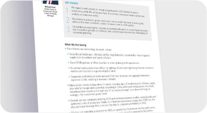 31 | 2023 Investment Outlook | December 12, 2022 INVESTMENT GRADE CREDIT Capturing Elevated Yields Without Longer Duration or Lower Quality KEY POINTS Richard Ford We expect credit spreads to remain range-bound in 2023, limited by macro Global Head of 1 uncertainty, while the anticipated lack of economic destruction means spreads are Investment Grade unlikely to make new wides. Credit, Portfolio Manager We believe investment grade credit yields are at levels that meet investor goals, 2 without the need to extend duration or move down in credit quality. Uncertainty is expected to decrease as central banks pivot to a more balanced policy 3 mix focused on growth and inflation, and cost increases become less challenging for corporate planning. What We Are Seeing ƒ Four themes are dominating the credit debate: y Geopolitical challenges—Ukraine conflict, deglobalization, sustainability—have triggered supply-side disruptions and higher inflation. y Zero-COVID policies in China have led to lower global growth expectations. y As central bank policies have shifted to fighting inflation with tightening financial conditions, markets are focused on a potential policy error. y Corporate profitability is under pressure from cost increases, and aggregate demand is expected to fall, resulting in increased defaults. ƒ Many recent trends look positive for credit, including signs of moderating U.S. inflation, supply- side relief in Europe and a potential reopening in China, with lower energy prices. As a result, valuations have moved to the tight end of our expected range—just above the long-run average—for investment grade credit. ƒ Overall, we see companies entering 2023 with defensive business models, strong liquidity and optimized costs of production thanks to efficiencies implemented during the COVID era. We also see lower leverage that considers the risks to corporate profitability in 2023. ƒ Markets are expecting a recession in 2023, as signaled by the inverted, risk-free yield curves. However, with employment remaining strong, nominal growth is expected to be positive. Moreover, with generally strong consumer balance sheets supported by the fiscal stimulus under COVID, we expect a “different” recession, where default rates do not spike. What We Are Doing ƒ We look to capture elevated investment grade credit yields, which we believe are at levels that can meet investor goals without the need to extend duration or move down in credit quality.