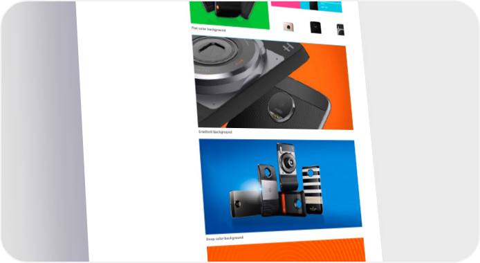 Motorola toolkit Color 41 02.06.2017 Gradient background Flat color background 1. Backgrounds Backgrounds form the foundation for our imagery. From solid to gradient colors we use light and shade to create depth and contrast, allowing our imagery to stand out and get noticed. Our bold and confident colors act as a bright canvas that showcase our products and messages, creating striking and distinctive communication. Deep color background Stylized background + horizon line