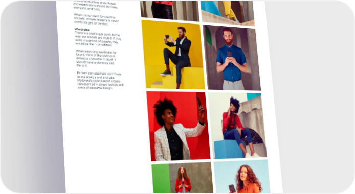 Motorola toolkit Imagery 53 02.06.2017 5. Talent & wardrobe Casting and wardrobe are integral to creating unique Motorola imagery. The Motorola world is young, fresh and future-forward. Our talent should have attitude and character that reflects this. Talent Our talent should be styled but never polished. It should be clear that they, and the environment they're in, are from a real place. Character and personality can be communicated through actions as much as style. Poses and expressions should be lively, energetic and bold. When using talent for creative content, ensure imagery is never overly staged or treated. Wardrobe There is a challenger spirit to the way our models are styled. If they were in a crowd of people, they would be the first noticed. When selecting wardrobe for talent, think of the styling as almost a character in itself. It should have a vibrancy and life to it. Pattern can also help contribute to the energy and attitude. Motorola's style is most closely represented in street fashion with a mix of costume design.