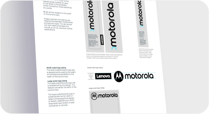 Motorola toolkit Logo size & position 32 02.06.2017 Scaling the Motorola logo on non-standard and extreme formats Always maintain the relative size relationships between the Motorola and Lenovo logos. This will ensure the right balance between the brands on all non-standard format applications: Small scale logo sizing Large scale logo sizing Width of Lenovo logo Width of Lenovo logo sets all four margins When sizing the Motorola and Lenovo logos on non-standard and extreme shaped formats, use the following principles: 1. Refer to the 'Logo sizes' tables shown earlier in this section to find the nearest dimensions. 2. If there is not a close size match in the 'Logo sizes' tables, use your best judgment to scale. Round the logo sizes up or down to the nearest whole number for ease of use. Refer to the examples shown throughout these guidelines as a guide. 3. Set all four margins to the width of the Lenovo logo. Lorem ipsum dolor sit amet, consectetur adipiscing elit. Morbi non lorem ligula. Duis luctus enim vitae tellus euismod, vitae pharetra lectus fi nibus. Sed sed semper orci. Skyscraper Event banners Due to the extreme shape format, the large scale Motorola logo is sized to fit exactly on its clear space, and the Lenovo logo doesn't appear. Event banners showing logos sized using best judgment and to suit the format and its purpose (i.e. strong visibility within the overall context of an event). Lorem ipsum dolor sit amet, consectetur adipiscing elit. Morbi non lorem ligula. Duis luctus enim vitae tellus euismod, vitae pharetra lectus fi nibus. Sed sed semper orci nunc sit amet neque. Small scale logo sizing The small scale Motorola logo size is determined by scaling the height of the Motorola wordmark to the width of the Lenovo logo. Large scale logo sizing The large scale Motorola logo size is determined by the margin. The margins are set by the width of the Lenovo logo. The large scale Motorola logo is scaled across the full width or height of the page from margin to margin, depending on which large scale logo version is used (horizontal or vertical).