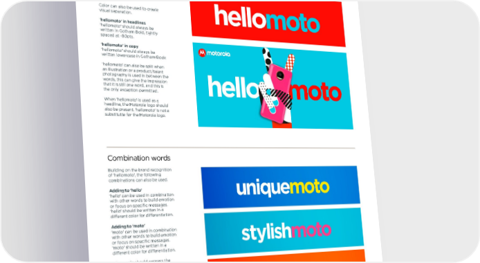 Motorola toolkit Typography 37 02.06.2017 hellomoto Combination words Drawing on our history, 'hellomoto' has an important role to play in building our brand recognition. 'hellomoto' can be used in headlines or in body copy, but must never be locked up with the Emsignia. It is a branding device, not a standalone brand. To maintain our trademark of 'hellomoto', it should always be written as one word. The only exception is where format space is limited, in which case it can be written over two lines. Color can also be used to create visual separation. ' hellomoto' in headlines 'hellomoto' should always be written in Gotham Bold, tightly spaced at -80pts. ' hellomoto' in copy 'hellomoto' should always be written lowercase in Gotham Book ‘hellomoto’ can also be split when an illustration or a product/talent photography is used in between the words, this can give the impression that it is still one word, and this is the only exception permitted . When 'hellomoto' is used as a headline, the Motorola logo should also be present. 'hellomoto' is not a substitutte for the Motorola logo. Building on the brand recognition of 'hellomoto', the following combinations can also be used. Adding to 'hello' 'hello' can be used in combination with other words to build emotion or focus on specific messages. 'hello' should be written in a different color for differentiation. Adding to 'moto' 'moto' can be used in combination with other words to build emotion or focus on specific messages. 'moto' should be written in a different color for differentiation. The words should express the brand personality of Motorola, or a particular feature of the product. hellomoto hellomoto hello moto uniquemoto stylishmoto hello chicago hello graduation