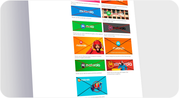 Motorola toolkit Motorola logo 13 02.06.2017 Never change the proportions of the Logo Always ensure there is enough contrast between the background and the Emsignia Always choose a background picture that allows legibility of the Logo Never use a solid yellow logo, keyline in yellow is fine Never use an Infill Emsignia with the wordmark Never use the wordmark on its own The ‘M’ inside the Flat color Emsignia should always be white Never lock-up ‘moto’ with the Emsignia, unless agreed with the Brand Team We will use the black wordmark when placing over a lightly colored image What not to do with our logo Never use the Stacked logo in a layout including product imagery and talent Never change the proportions of the Stacked logo Lorem ipsum dolor sit amet, consectetur adipiscing elit. Duis vitae justo nibh. Aenean et ornare felis. Curabitur in ligula maximus, sagittis neque sit amet, ultricies massa. Sed lorem tortor, placerat quis viverra id, sollicitudin at enim. Donec nisl dolor, ullamcorper non tempus eget, ullamcorper nec dolo Never obscure the logo with imagery that compromises its legibility Never use a different color Emsignia in the same communication