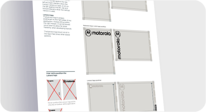Motorola toolkit Logo size & position 31 02.06.2017 To ensure consistency across our communications, we have fixed logo positions for the Motorola and Lenovo logos. Motorola small-scale logo The small scale version of the Motorola logo must be positioned in the top left corner of any application. It sits against the top and left margins. Motorola large-scale logo The large scale version of the Motorola logo must be positioned at the top or left of any application. It sits at the top against the top, left and right margins when the horizon version is used, or sits on the left against the left, top and bottom margins when the vertical version is used. Lenovo logo The Lenovo logo is always positioned on the right edge of any application. Always sitting within the right margin, it can be moved up or down to allow for more flexibility when developing layouts. The Lenovo logo must not sit in the logo-free zones when space permits. How not to position the Lenovo logo Motorola large-scale logo position Motorola small-scale logo position Lenovo logo position Logo position Never position the Lenovo logo at the very top or bottom of the application. The Lenovo logo is always seen in its vertical orientation.