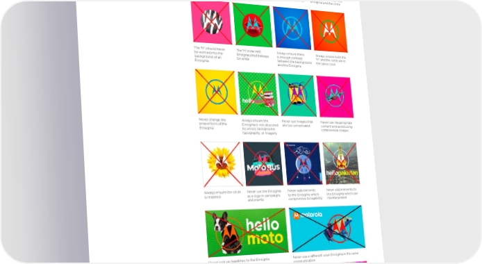 Motorola toolkit Emsignia 19 02.06.2017 Always ensure the Emsignia is not obscured by a busy background, typography, or imagery Never use inappropriate content and avoid using controversial images Always ensure the circle is retained The Emsignia should not be cropped in irregular shapes Never lock up the Emsignia with ‘moto’. For exceptions contact the Brand Team Never use the Emsignia as a logo in campaigns and events Never add elements to the Emsignia which compromise its legibility Never add elements to the Emsignia which can misinterpreted Never lock up headlines to the Emsignia Never use images that are too complicated Never use yellow a Solid color Emsignia Never use the Emsignia as a see through, apart from in 3D applications The ‘M’ in Solid color Emsignia should always be white Never alter the proportions between the Emsignia and the circle The ‘M’ should never be worked into the background of an Emsignia The ‘M’ in the Infill Emsignia should always be white Always ensure both the ‘M’ and the circle are in the same color Never change the proportions of the Emsignia Always ensure there is enough contrast between the background and the Emsignia What not to do with our Emsigna Never use a different color Emsignia in the same communication